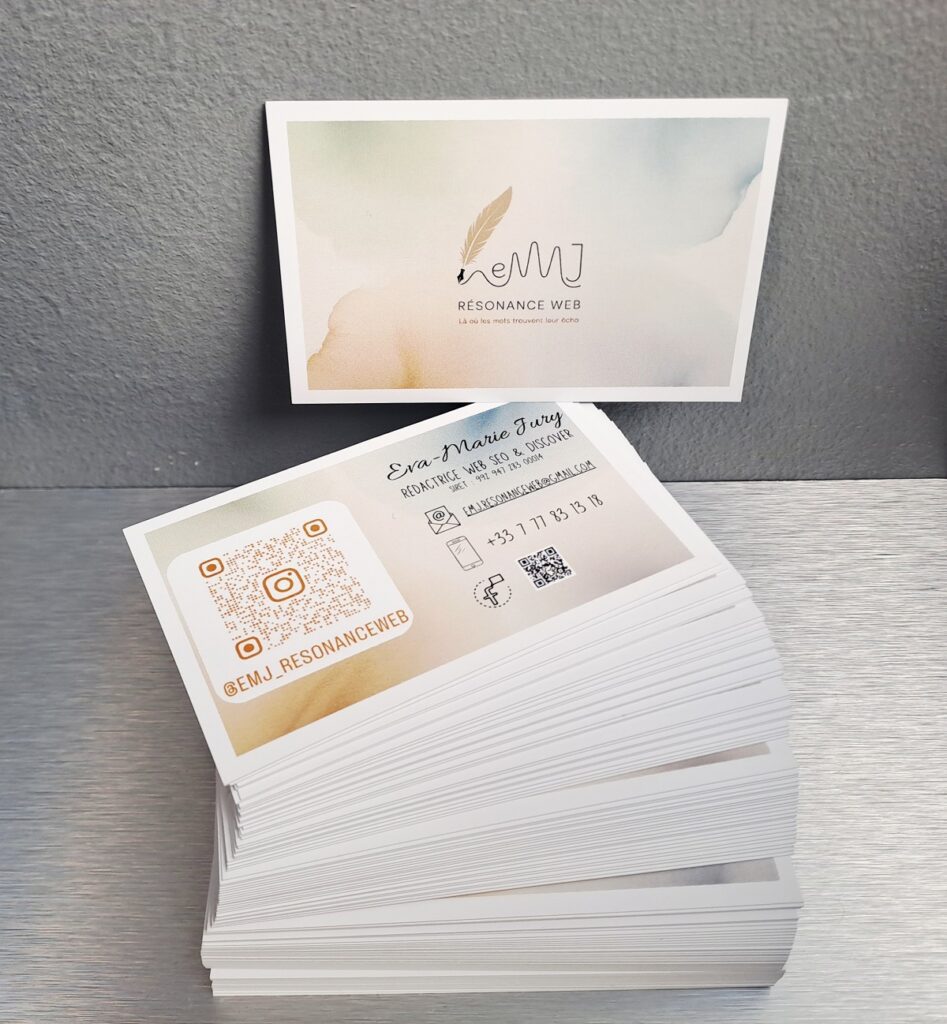 hez Decograph Imprimerie, nous savons qu’une carte de visite professionnelle est bien plus qu’un simple support papier : c’est le reflet de votre identité, de votre expertise et de votre image de marque. Pour Résonnance WEB EMJ, rédactrice web spécialisée, nous avons réalisé des cartes de visites recto verso ainsi que des flyers personnalisés, afin de mettre en valeur son activité et de renforcer sa visibilité auprès de ses clients.